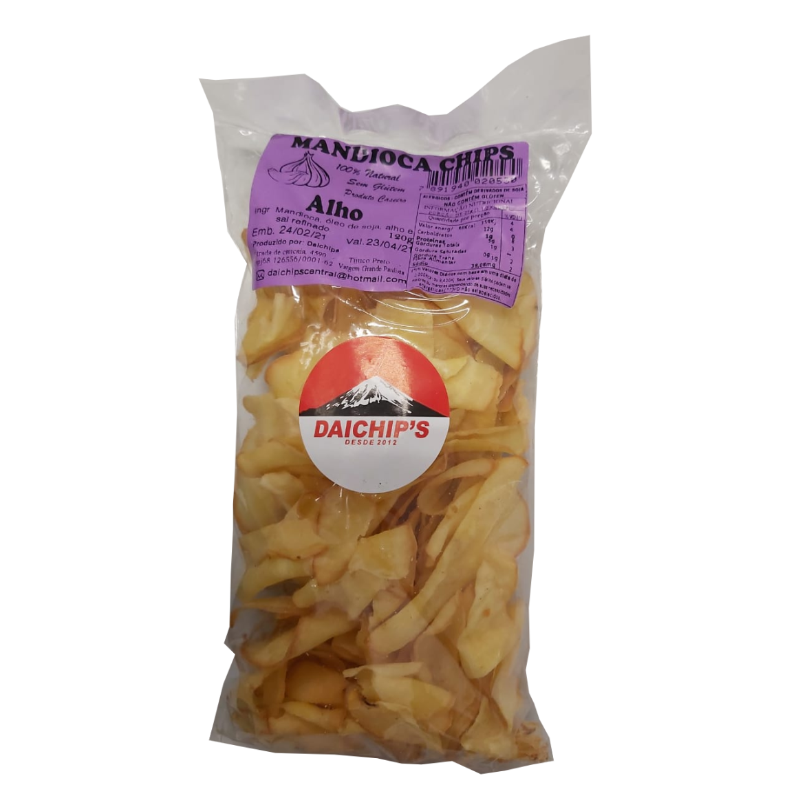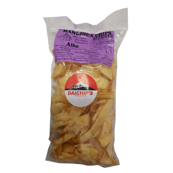 O Chips de Mandioca de Alho, é um salgadinho elaborado a partir de ingredientes naturais, oferecendo um produto de qualidade e mais saudável, mantendo o sabor natural e torna o produto mais especial. Sem Glútem